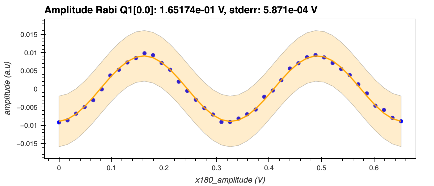 This amplitude is plotted as a function of the amplitude of the second drive pulse, and a sinusoidal function is fit to it. The \(\pi\)-pulse amplitude for the 1-2 transition is determined as the driving pulse amplitude that yields the first maximum of the sinusoid. For example, in the figure below, this occurs at ~0.165.