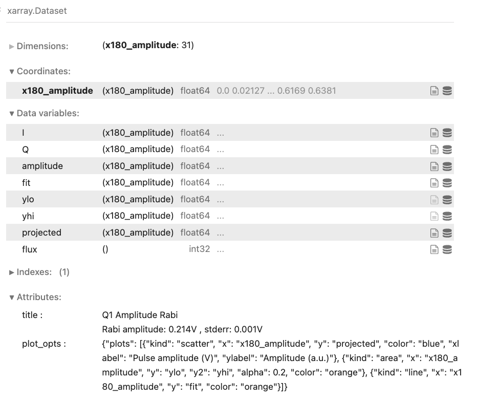- experimental results: measured values such as resonance frequencies, \(\pi\)-pulse amplitudes, decay timescales, etc.