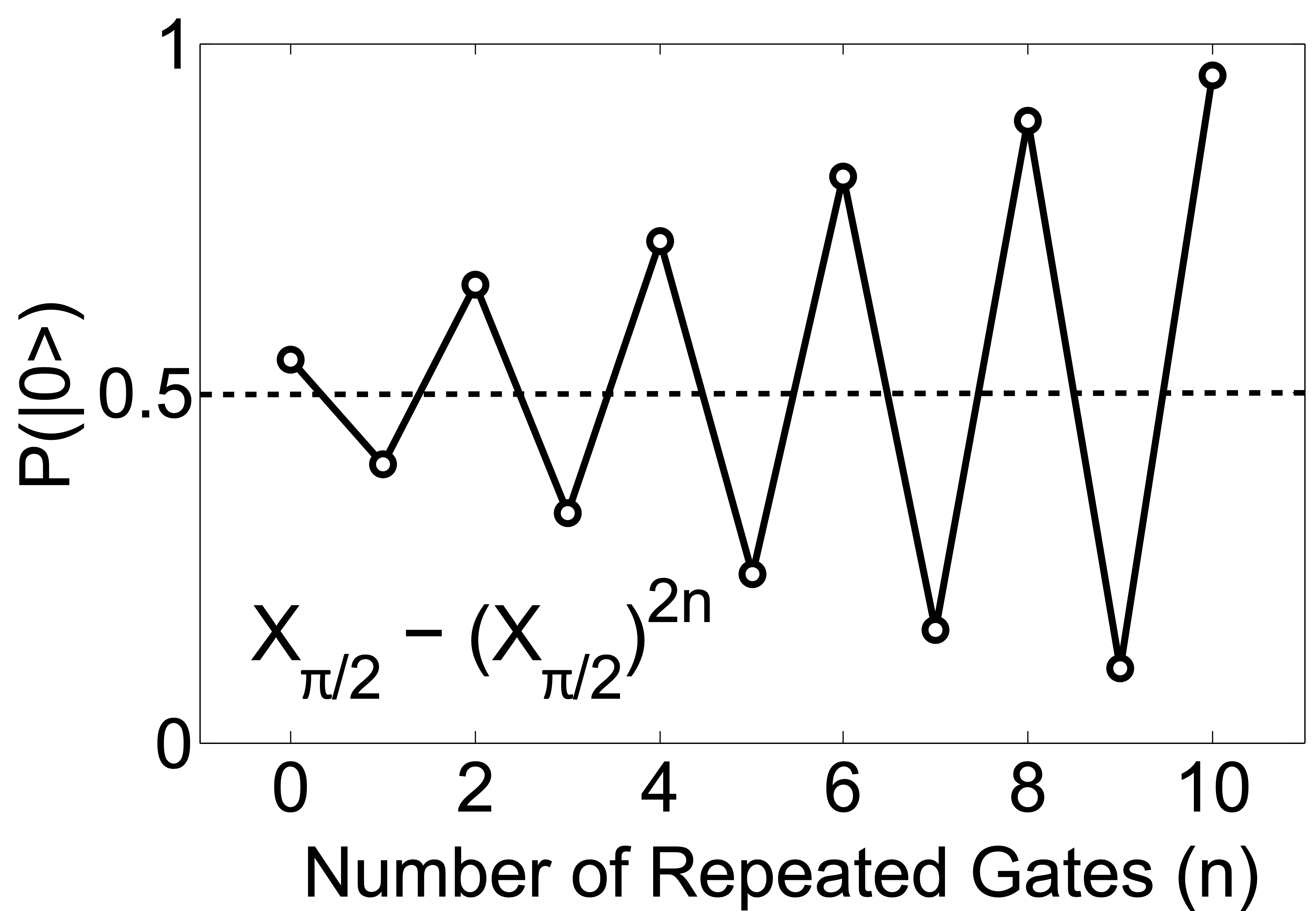 In this experiment, the \(\frac{\pi}{2}\) pulse (\(R_{x}(\frac{\pi}{2})\) gate) is tuned by repeating the pulse in the sequence [\(R_{x}(\frac{\pi}{2})\) - \((R_{x}(\frac{\pi}{2}))^{2n}\)]. The first \(\frac{\pi}{2}\)-pulse prepares the qubit in the superposition state \(\frac{1}{\sqrt{2}}(|0\rangle +|1\rangle)\). This is important since error amplification experiments are most sensitive to angle errors when we measure points along the equator of the Bloch sphere.