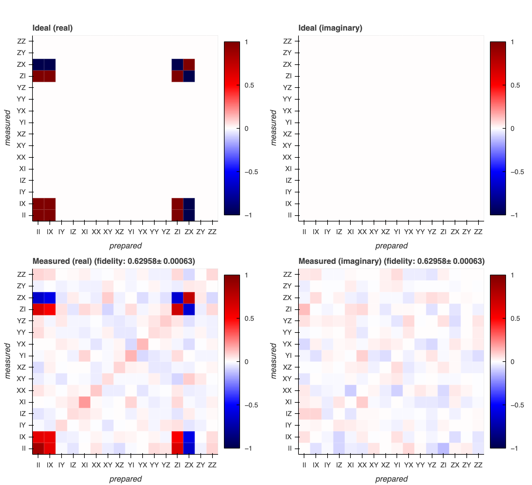 ProcessTomographyobject with the target quantum circuit (target_circ). The tomography is performed using the state vector simulator backend (aer_simulator_statevector) with a specified number of shots (statevector_shots) 3. -