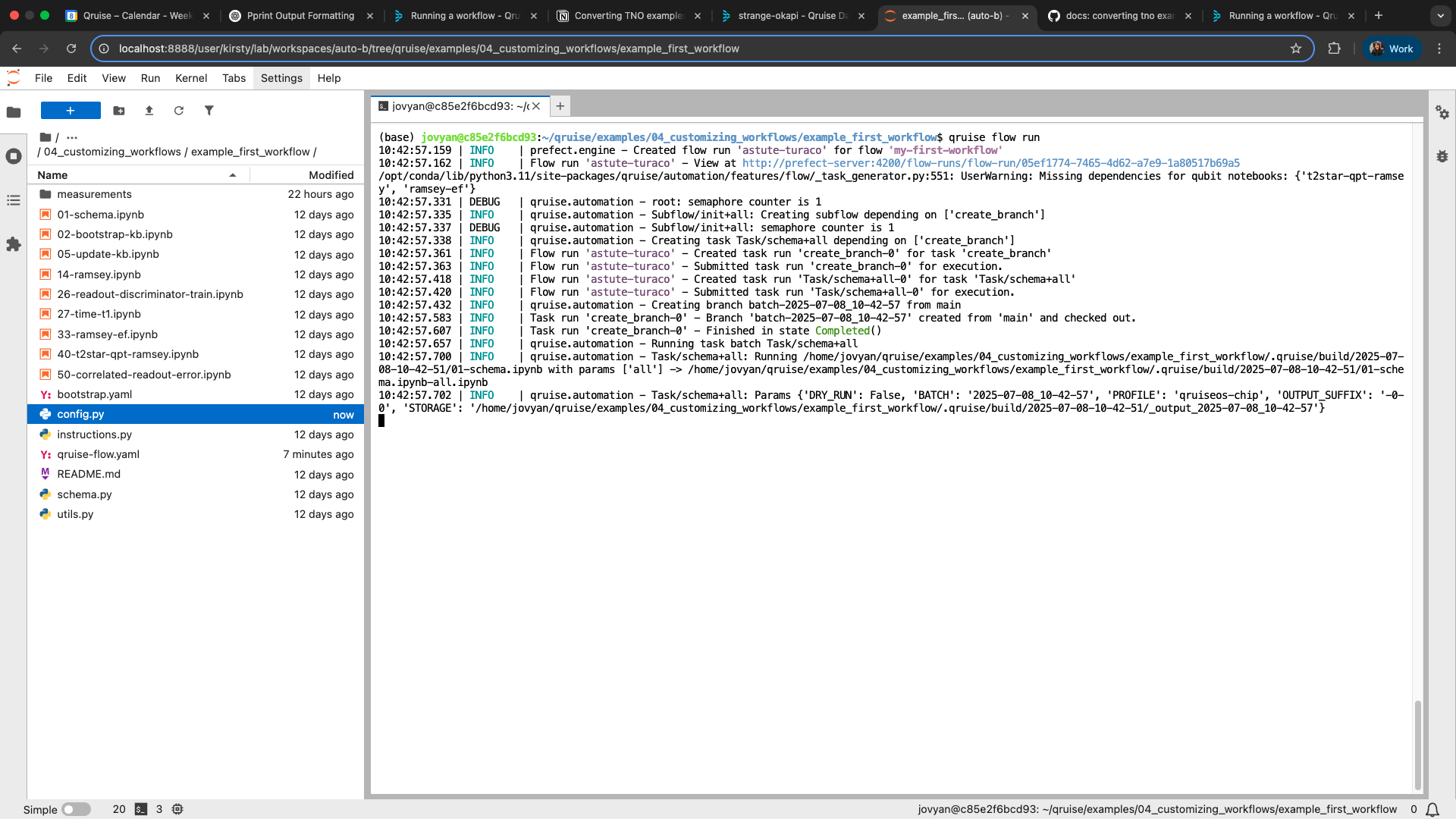 Task notebooks are named according to <ordinal-number>-<task name>.ipynb. The task name helps identify the task in the workflow and should match the name used in qruise-flow.yaml. The ordinal number does not affect the execution order of tasks, but it can be useful for keeping files organised in the intended sequence. The ordinal numbers can also be used to implement custom experiment selection; for example, if you only want to run certain tasks in a workflow.