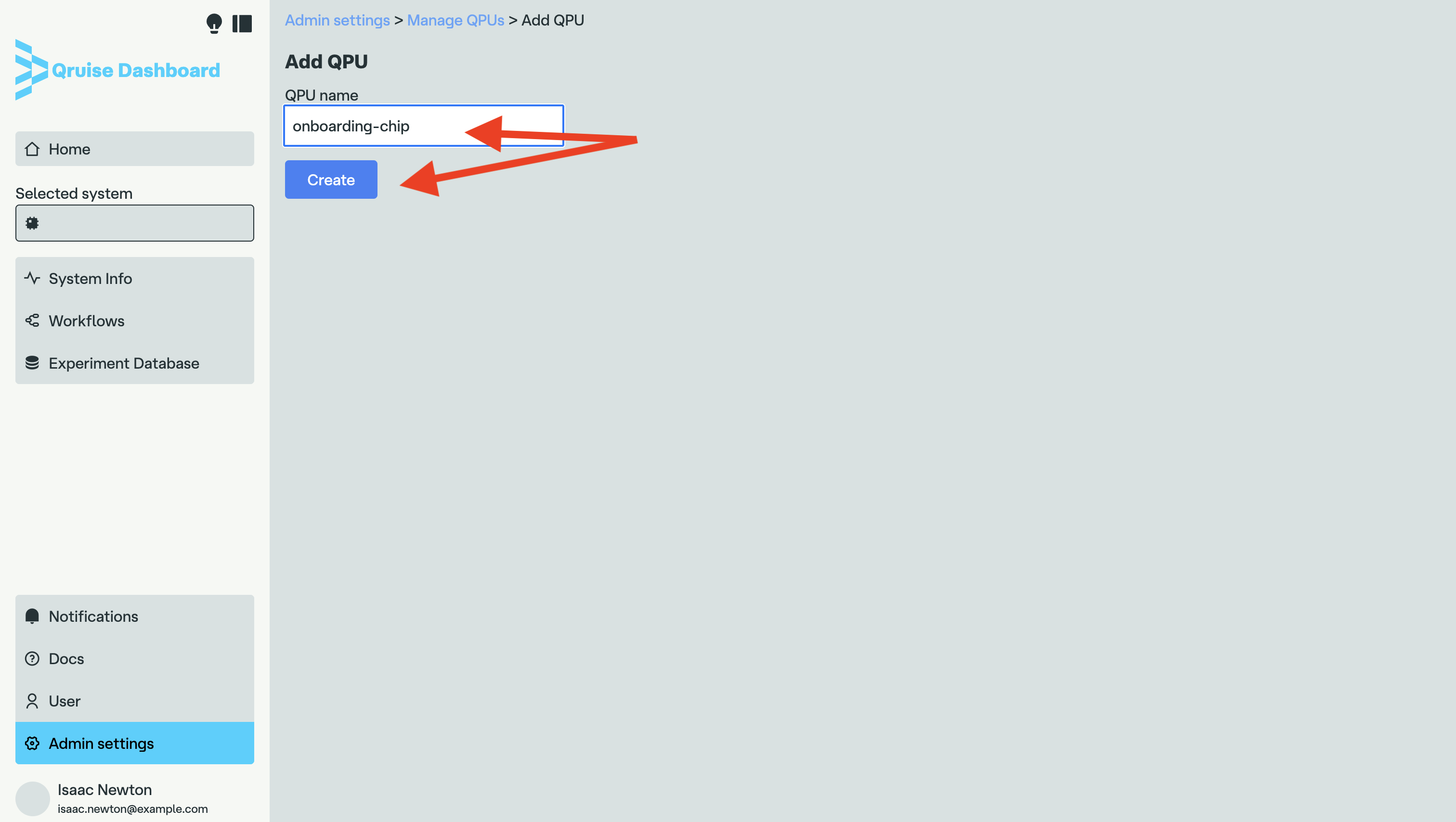 In the page that opens, you can enter the name of the QPU to add. In this example, we'll add a QPU named onboarding-chip in anticipation of the tutorials that will be presented later. After filling in the text box, click on the "Create" button to finish the procedure, as shown in the screenshot below.