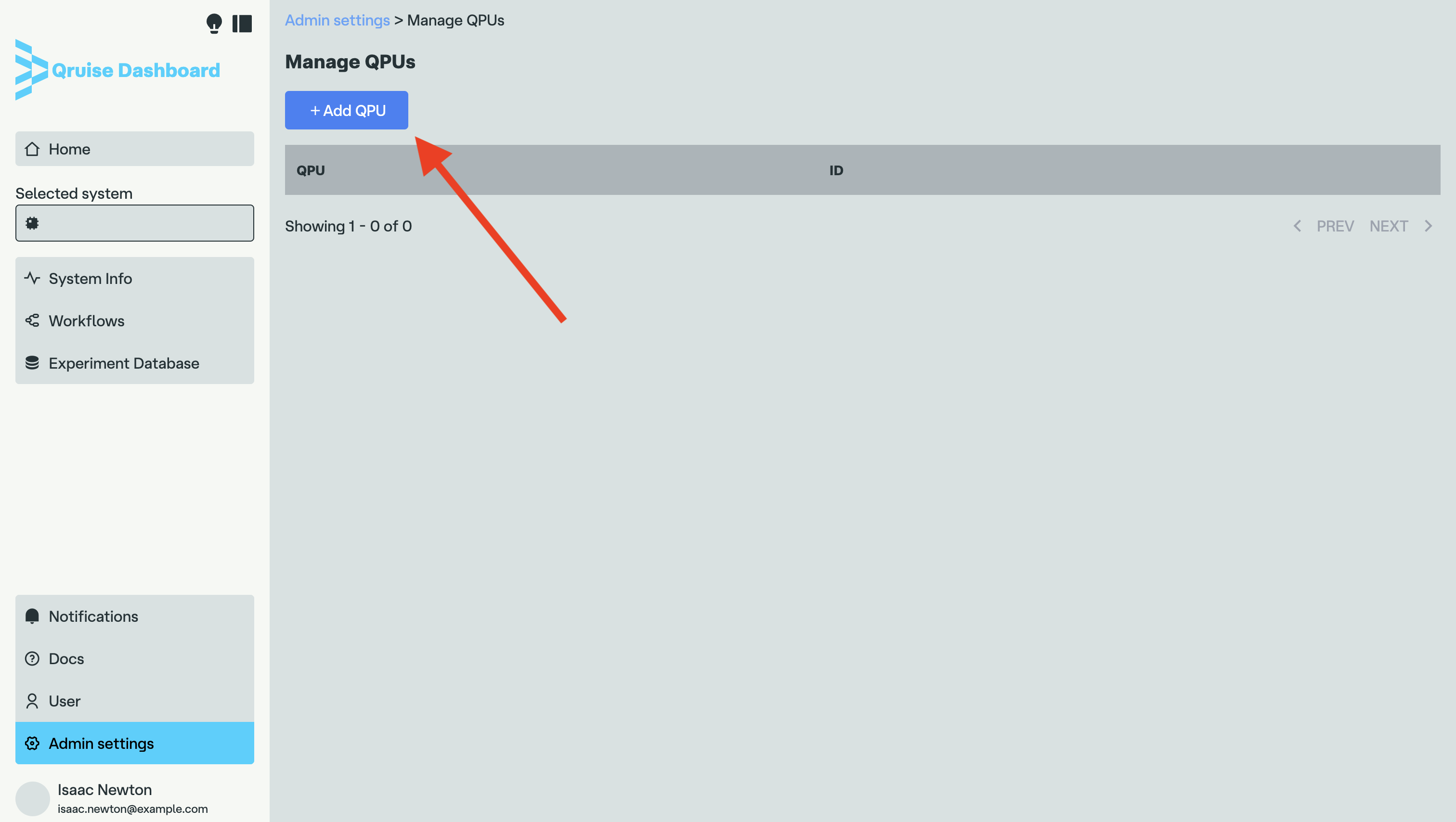 After creating the tenant admin account, the next step is adding a new QPU to QruiseOS. This can be achieved either via the dashboard or the Qruise CLI. In this article, we will use the former method. The latter will be described later in the advanced topics.