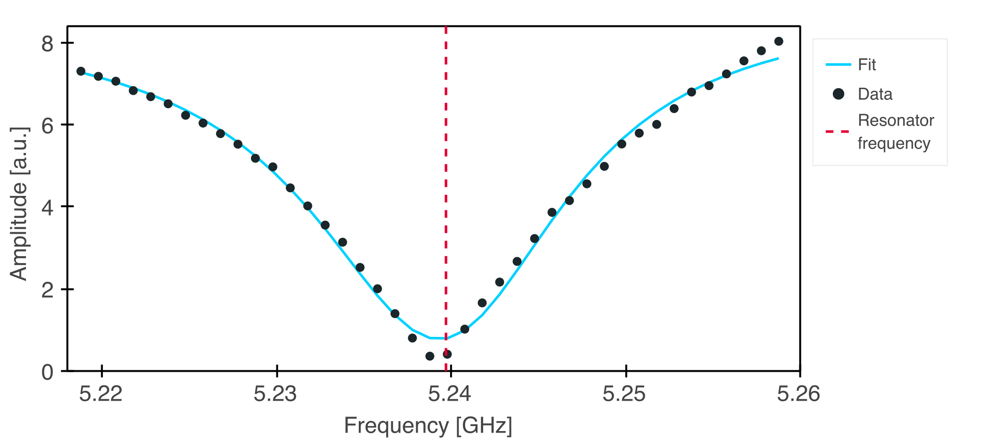 This amplitude is plotted as a function of frequency, and the modified resonator frequency is extracted from the centre of a Fano line shape fit to the data.