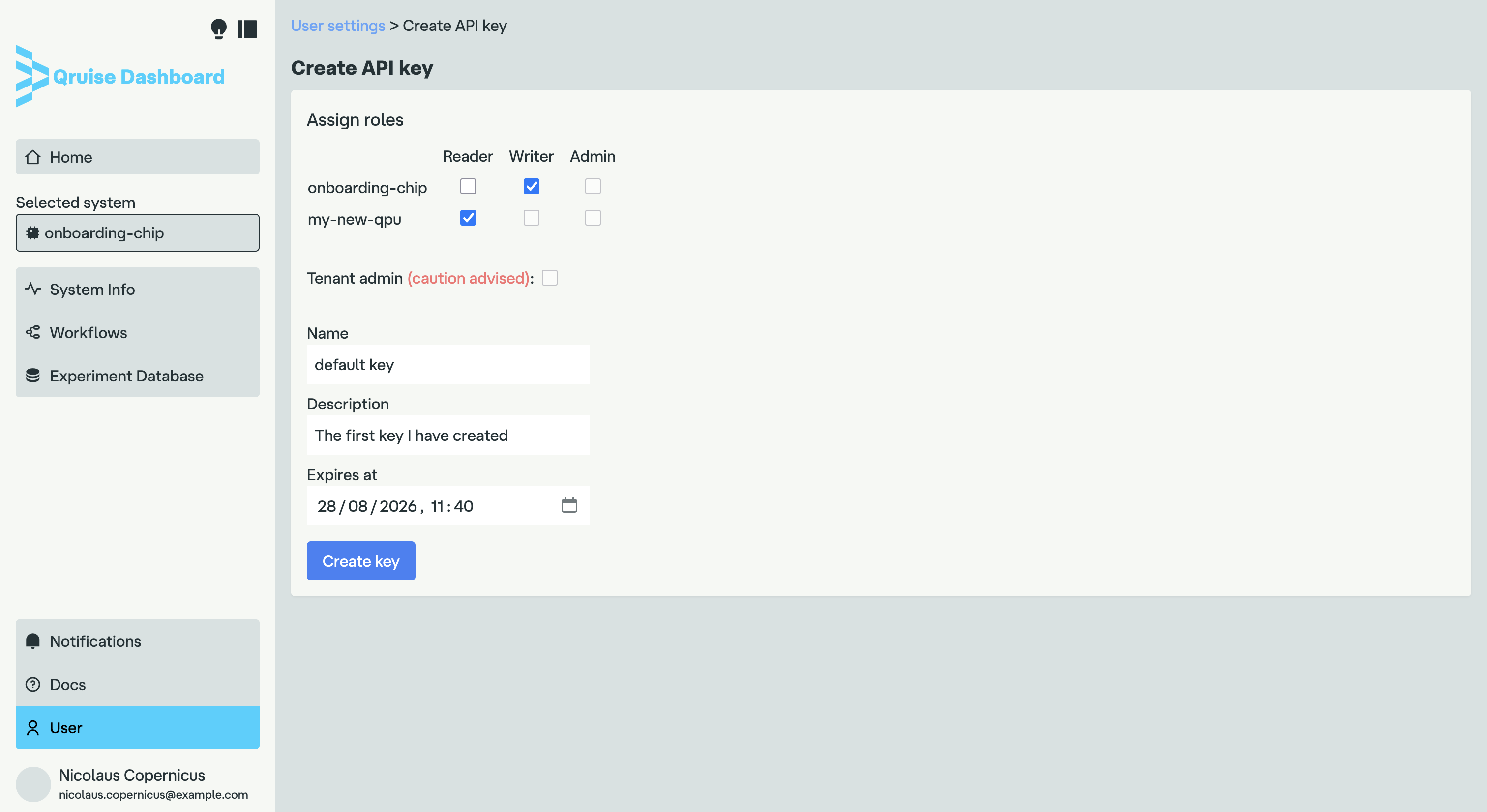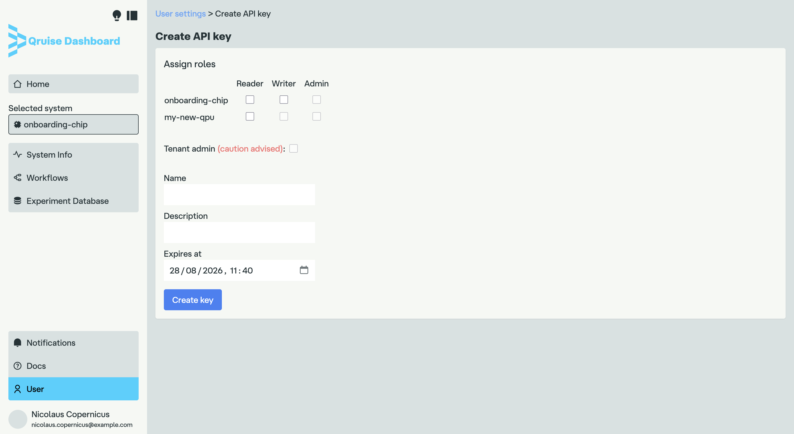 At the top of the page, you can see the roles permissions for the API key. The leftmost column contains the names of the QPUs you have access to. In our example, those are "onboarding-chip" and "my-new-qpu". To the right of the QPU name, checkboxes specify which roles will be assigned to the key, as specified by the topmost row. As you can see, there are three different roles: Reader, Writer, and Admin. You can select only the roles that were assigned to you by your administrator — the rest will be greyed out. In our example, the user has the Writer role for the "onboarding-chip" QPU, but only a Reader role for "my-new-qpu".