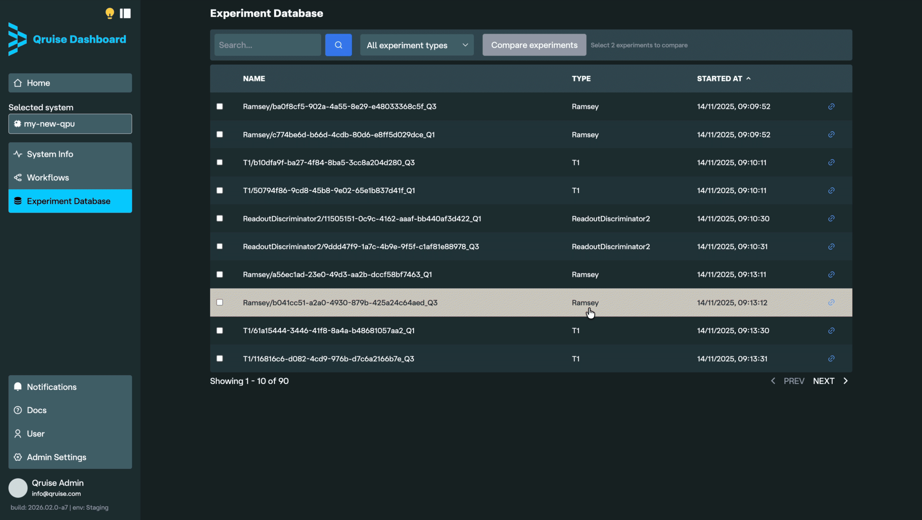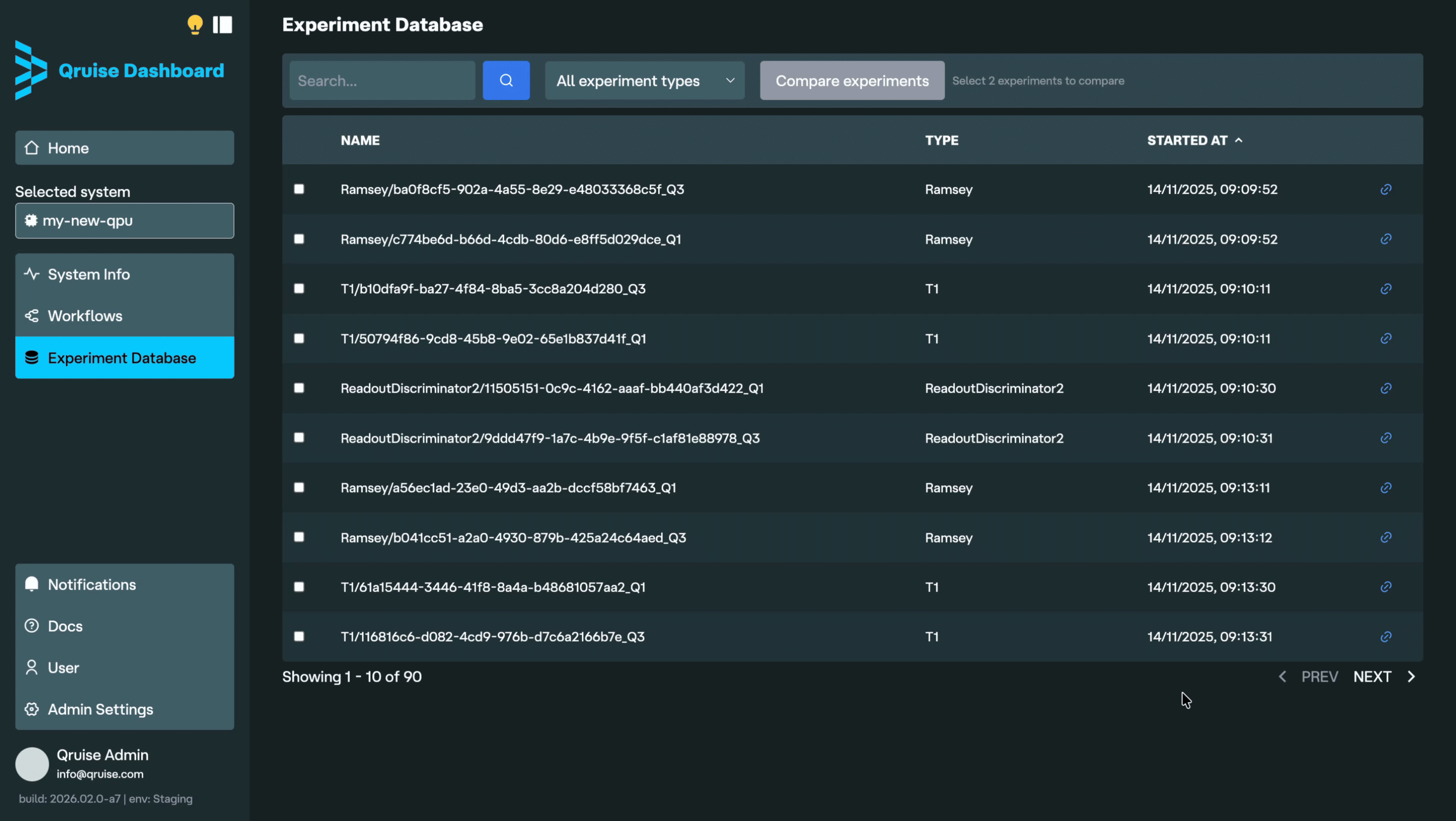 For each QPU, you can click on the Experiment Database to view all past experiments performed on that QPU and sort them by experiment name or start time. You can also filter by experiment type or use the search bar to look up experiments by these fields, as well as by qubit or experiment ID. This makes it easy to track your QPU’s behaviour over time.