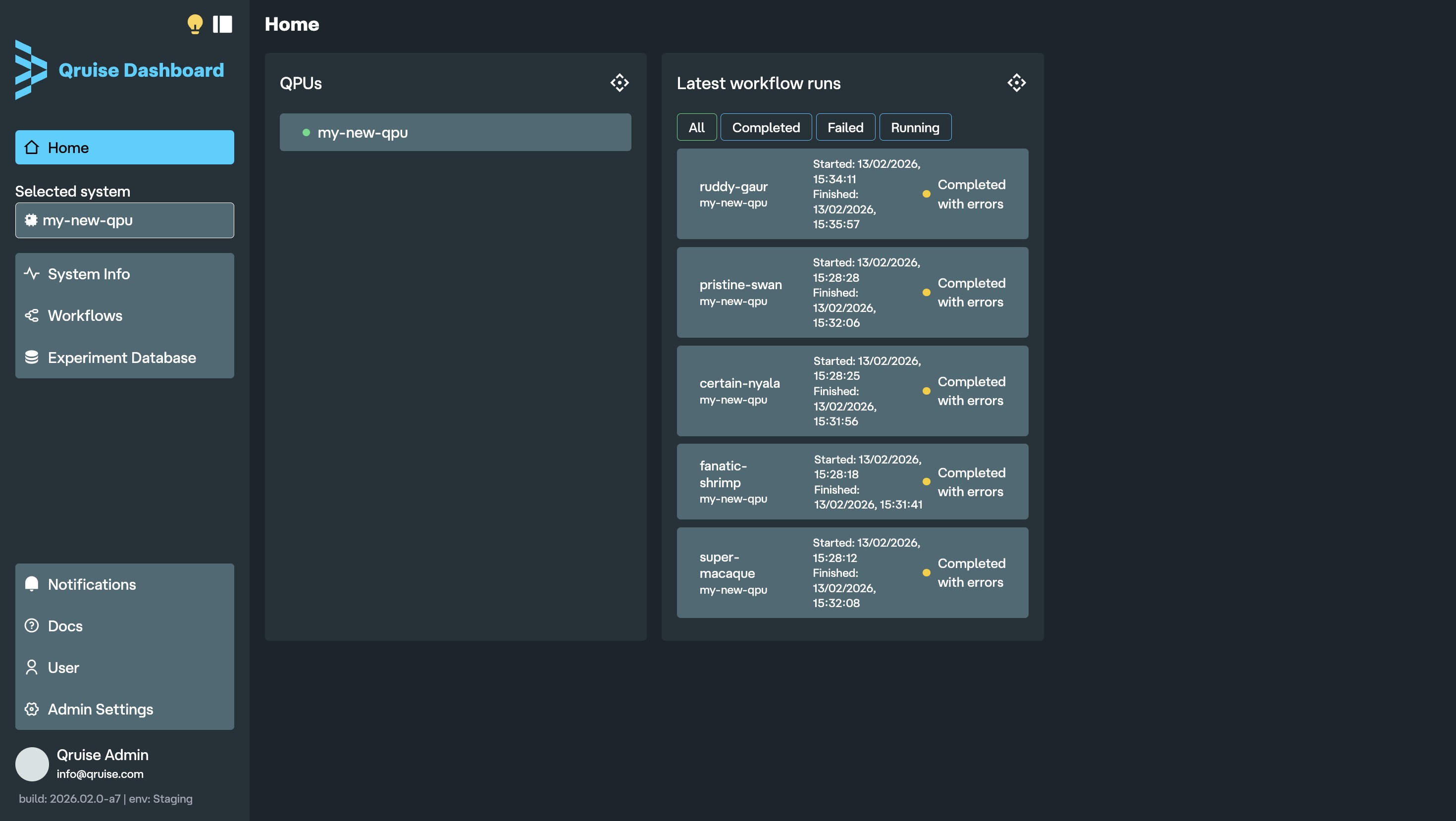 The dashboard home provides a quick overview of available QPUs on the left-hand side and the most recently run workflows on the right-hand side.