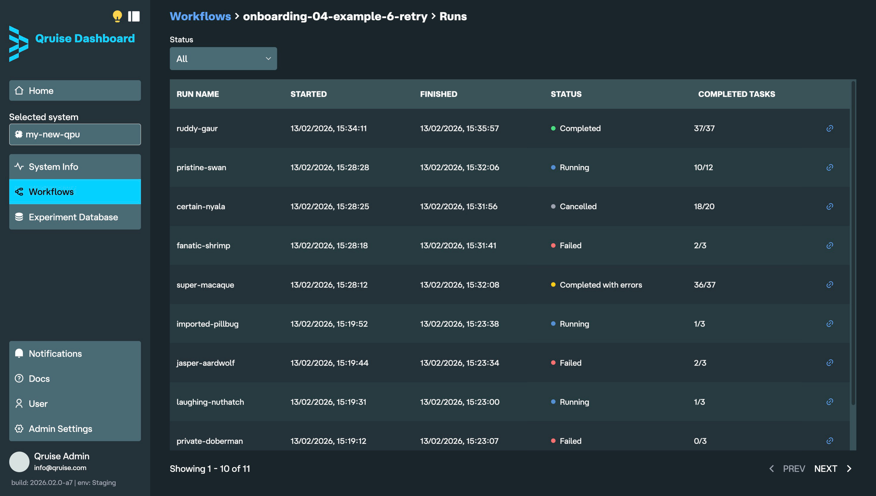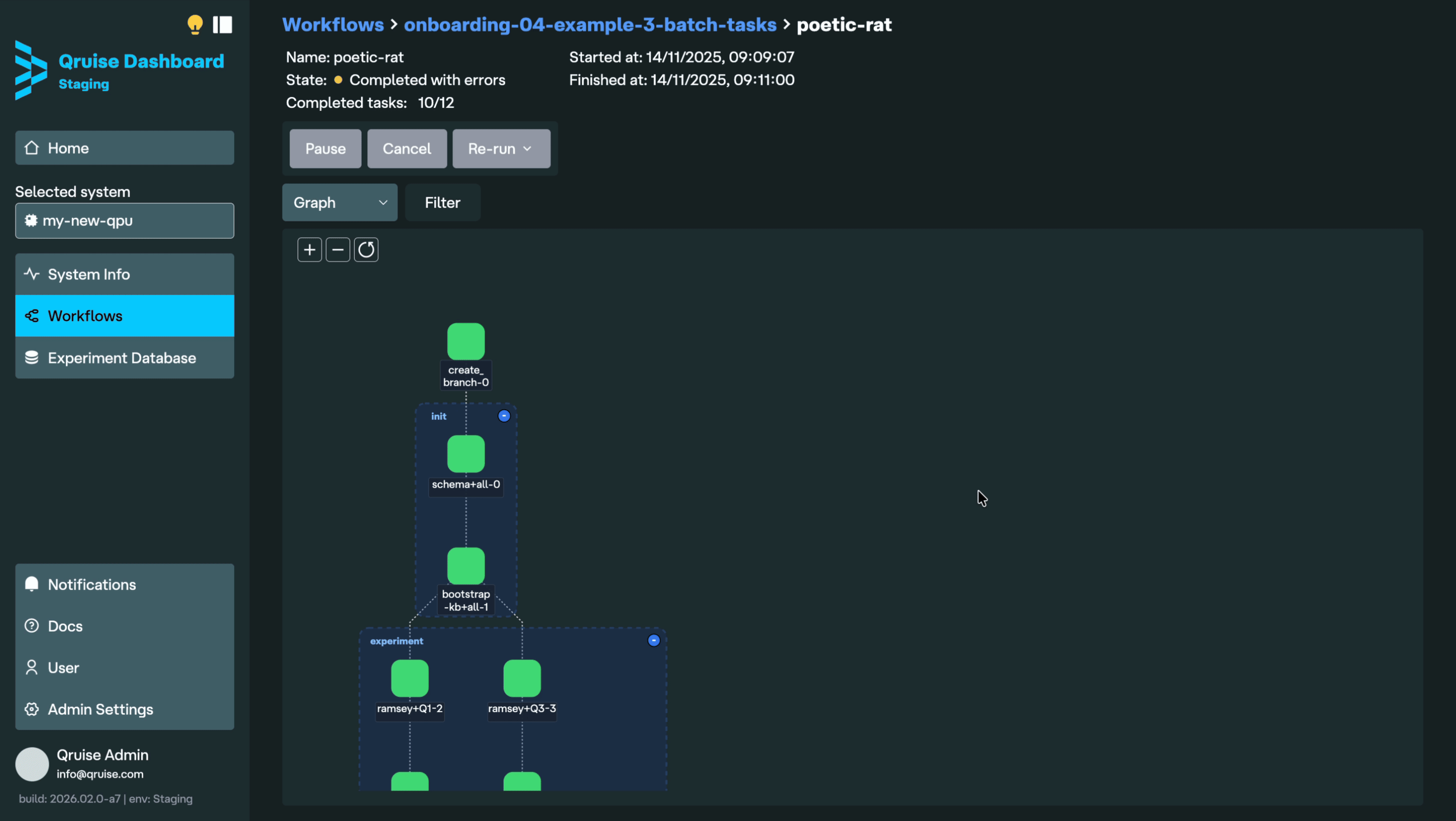 The QruiseOS dashboard makes it easy to keep track of all your QPU data. From high-level overviews of devices and workflows to the results of individual experiments, it provides a clear, easy-to-use interface for exploring and understanding your quantum systems.