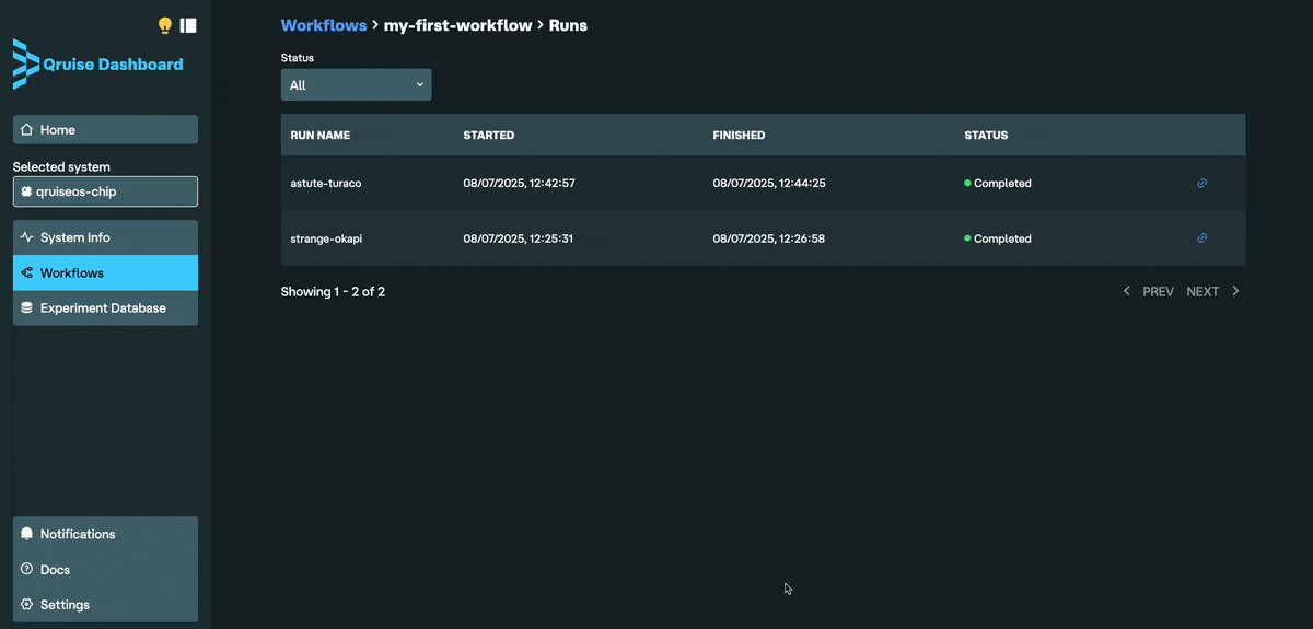 Task notebooks are named according to <ordinal-number>-<task name>.ipynb. The task name helps identify the task in the workflow and should match the name used in qruise-flow.yaml. The ordinal number does not affect the execution order of tasks, but it can be useful for keeping files organised in the intended sequence. The ordinal numbers can also be used to implement custom experiment selection; for example, if you only want to run certain tasks in a workflow.