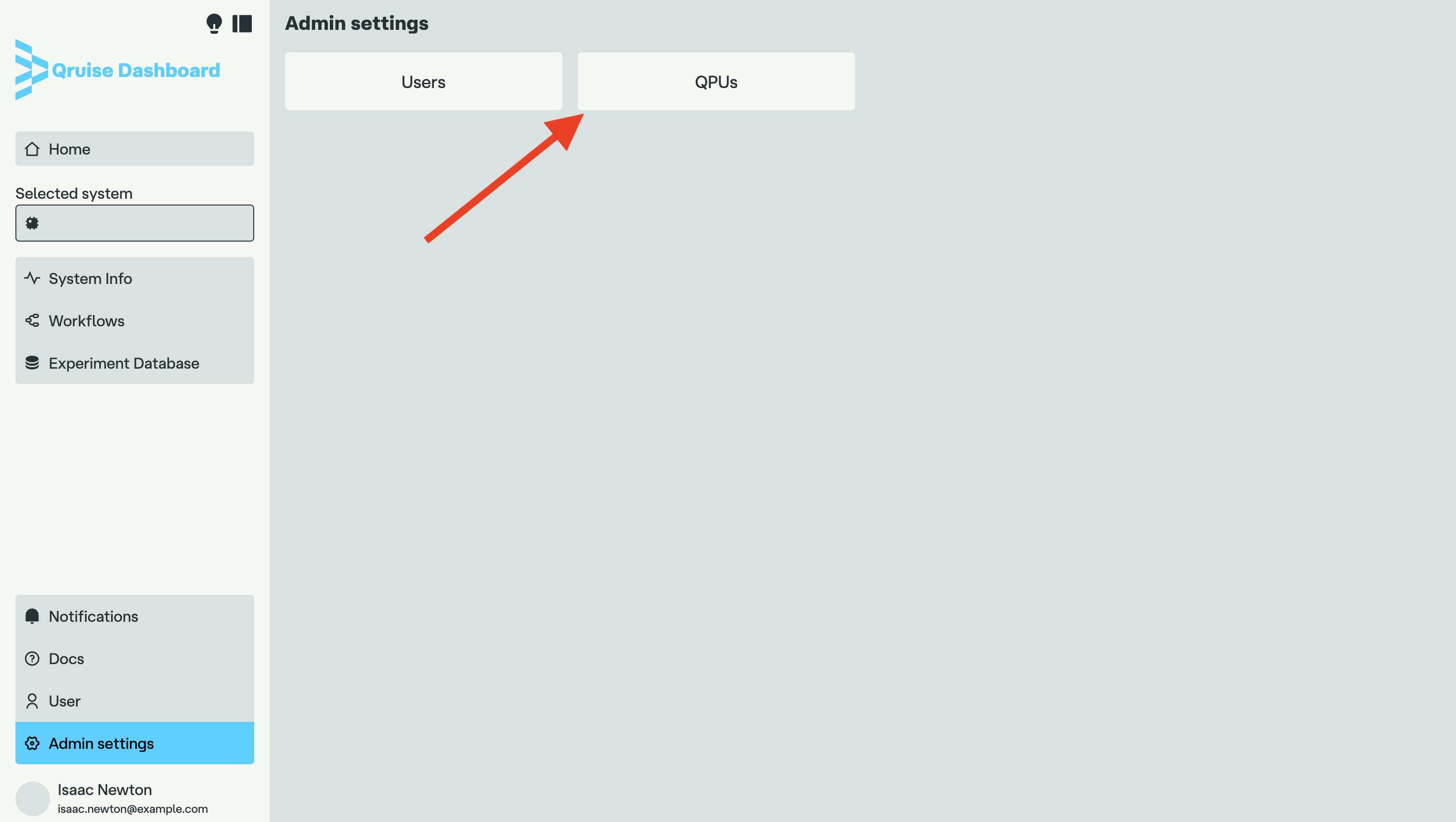 You will be navigated to the tenant administrator page. Now select the "QPUs" button to open the QPU management view: