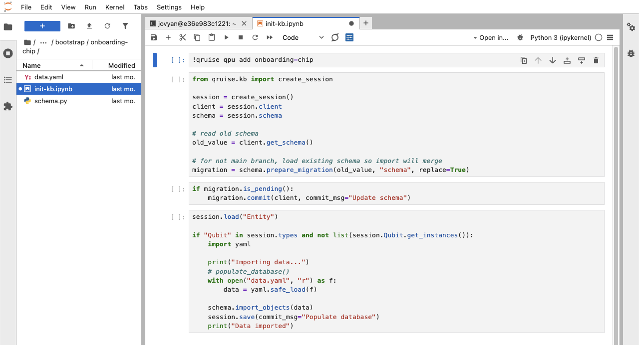 Alternatively, for an example chip like onboarding-chip, you can run a bootstrap notebook. This imports the schema and some example data for the QPU automatically so you can continue with the next tutorials. To do this, go to the folder /qruise/admin/bootstrap/onboarding-chip in your JupyterLab environment and run the init-kb.ipynb notebook.